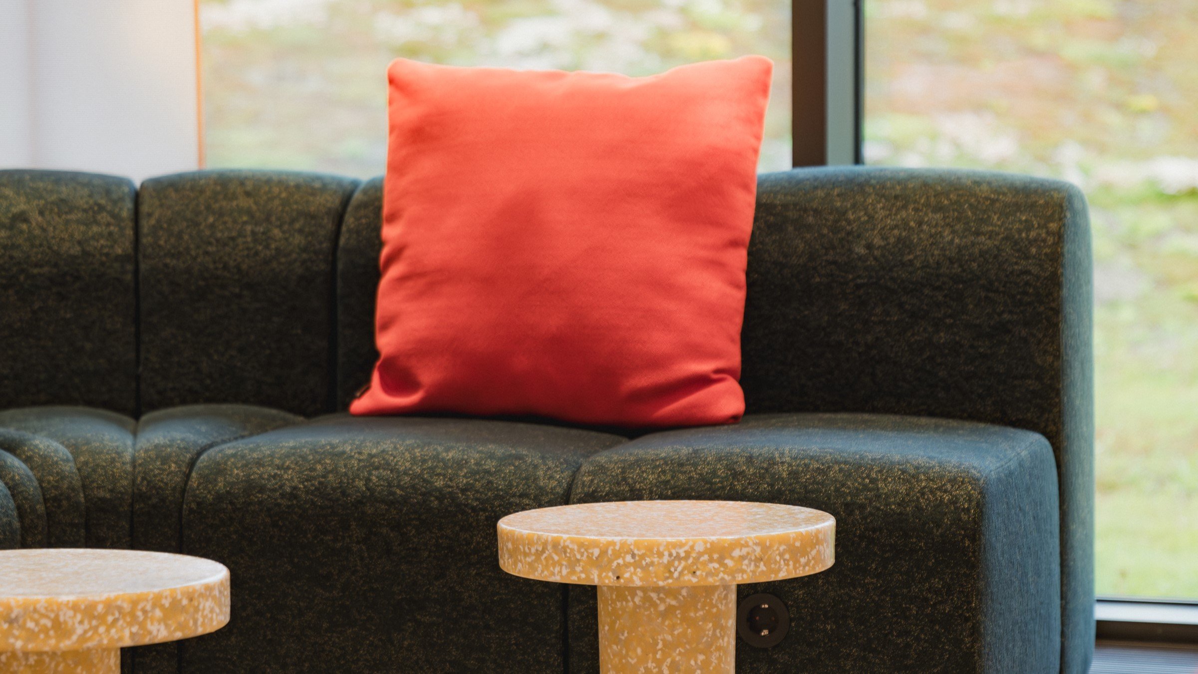 Härligt avslappnat rum med två stora loungesoffor som bjuder in till dialog. Pallarna i återvunnen plast skapar flexibla, förenklade sittmöjligheter och borden är höj- och sänkbara samt lätta att flytta runt. Passar utmärkt för exempelvis informella möten och teamwork. Aktivera kollegerna i en kreativ miljö!